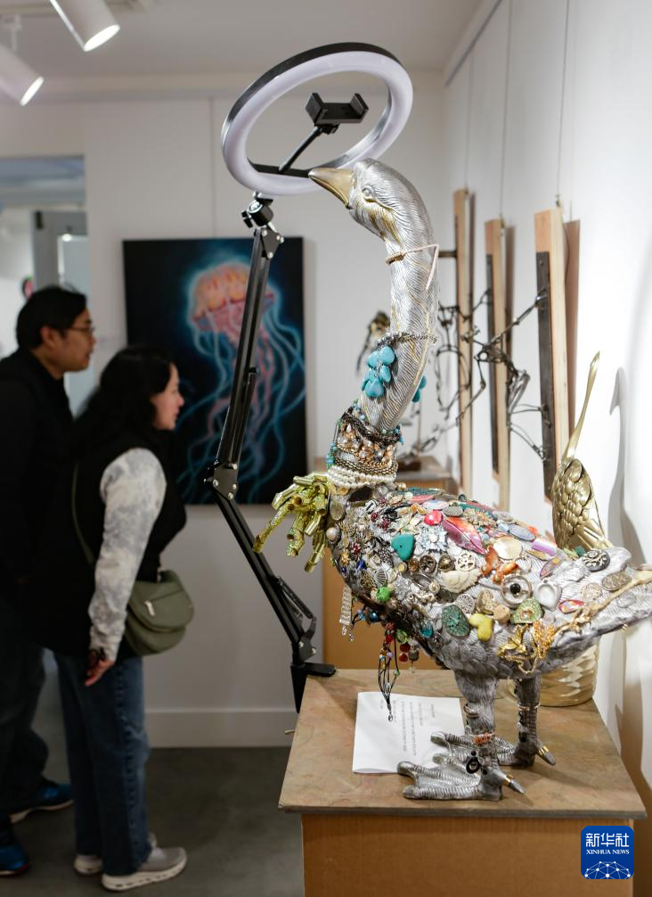 加拿大伯纳比4月18日举办回收材料艺术展,汇集了19名当地艺术家利用回收材料制作的艺术品。