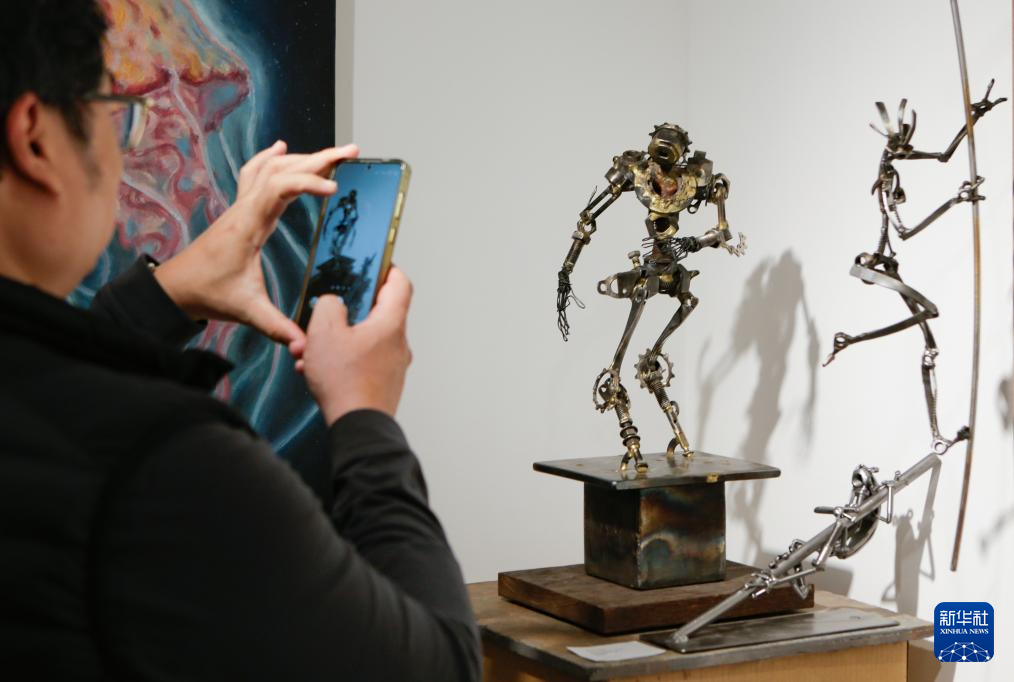 4月18日,参观者在加拿大伯纳比举行的回收材料艺术展上拍摄展品。