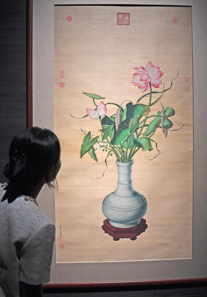 4月27日,一名记者在观看清宫画家郎世宁画作《池莲双瑞》。新华社记者 陈铎 摄