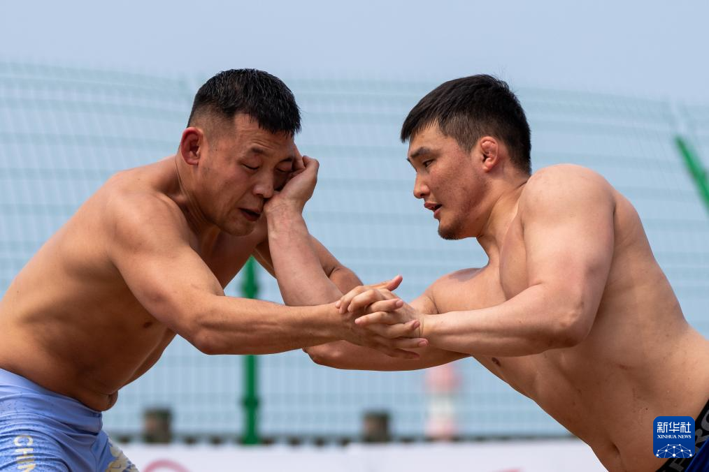 4月29日,蒙古国选手图尔博尔德·冈博尔德(左)与中国选手李培隆在比赛中。