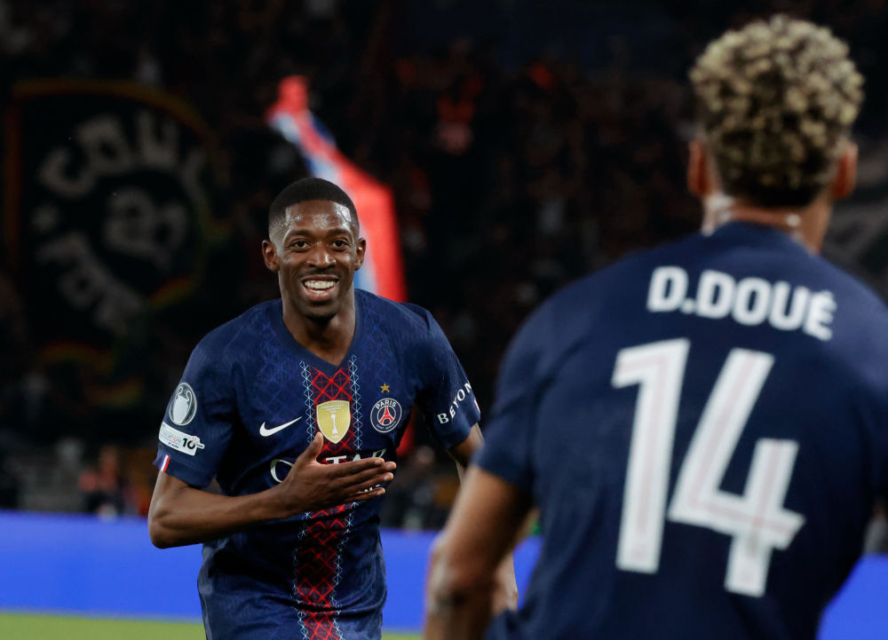 4月28日,巴黎圣日耳曼队球员登贝莱(左)在进球后庆祝。新华社发(亨利·施瓦茨摄)