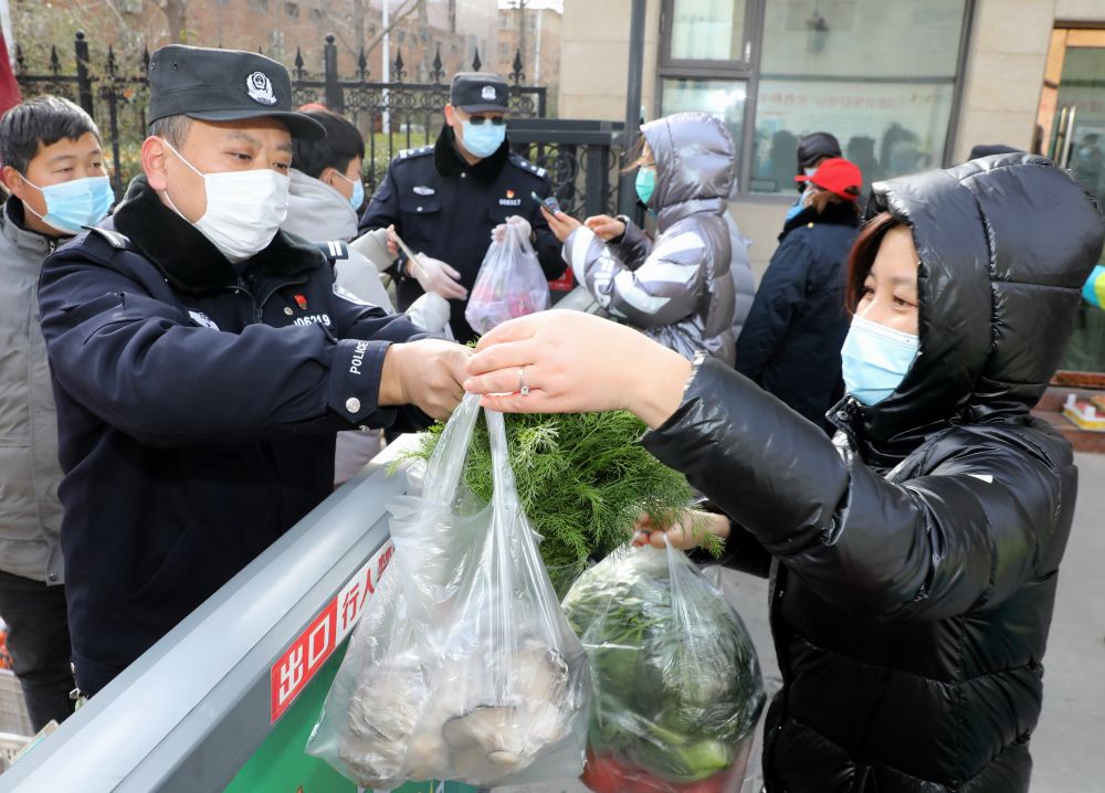 ↑ 1月10日,在石家莊市橋西區(qū)東風(fēng)北路社區(qū),民警在協(xié)助蔬菜配送員為居民配送蔬菜。