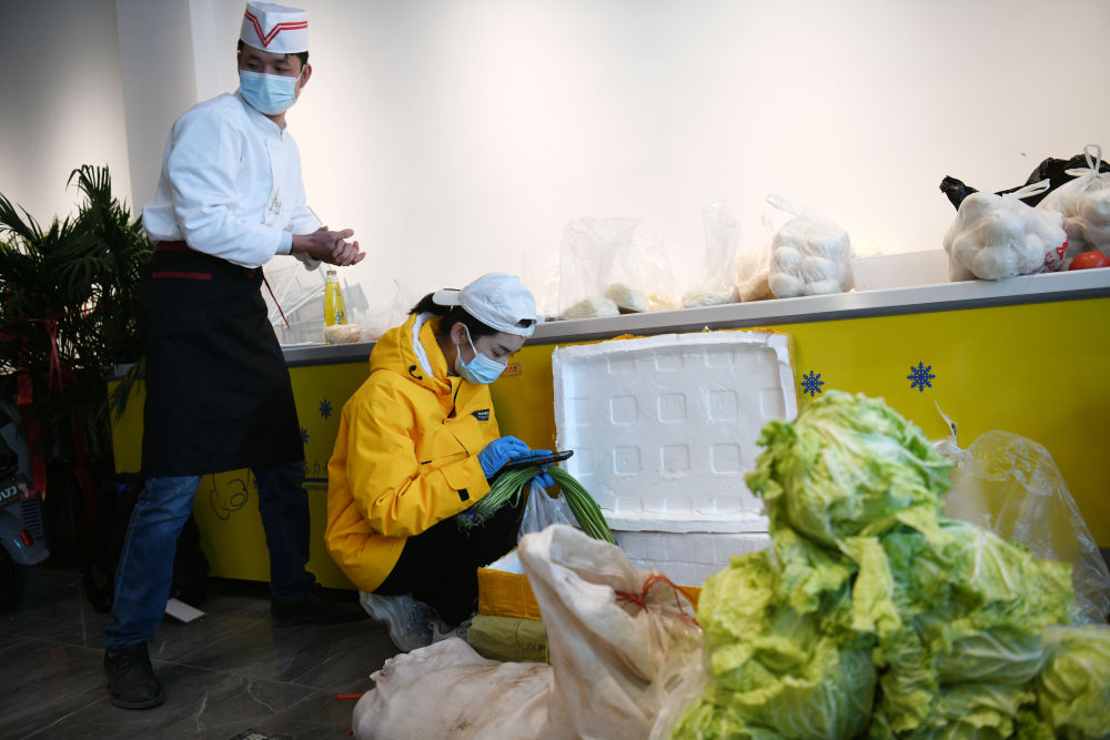 ↑1月11日,汪新建(左)和張琪琪夫婦在準(zhǔn)備給鄰居們送菜。生活在河北石家莊市玉蘭苑小區(qū)的夫婦二人,在小區(qū)門(mén)口開(kāi)了一家餐廳,夫妻倆帶著廚師和司機(jī),為社區(qū)的工作人員免費(fèi)提供盒飯,義務(wù)給鄰居們跑腿買(mǎi)菜。