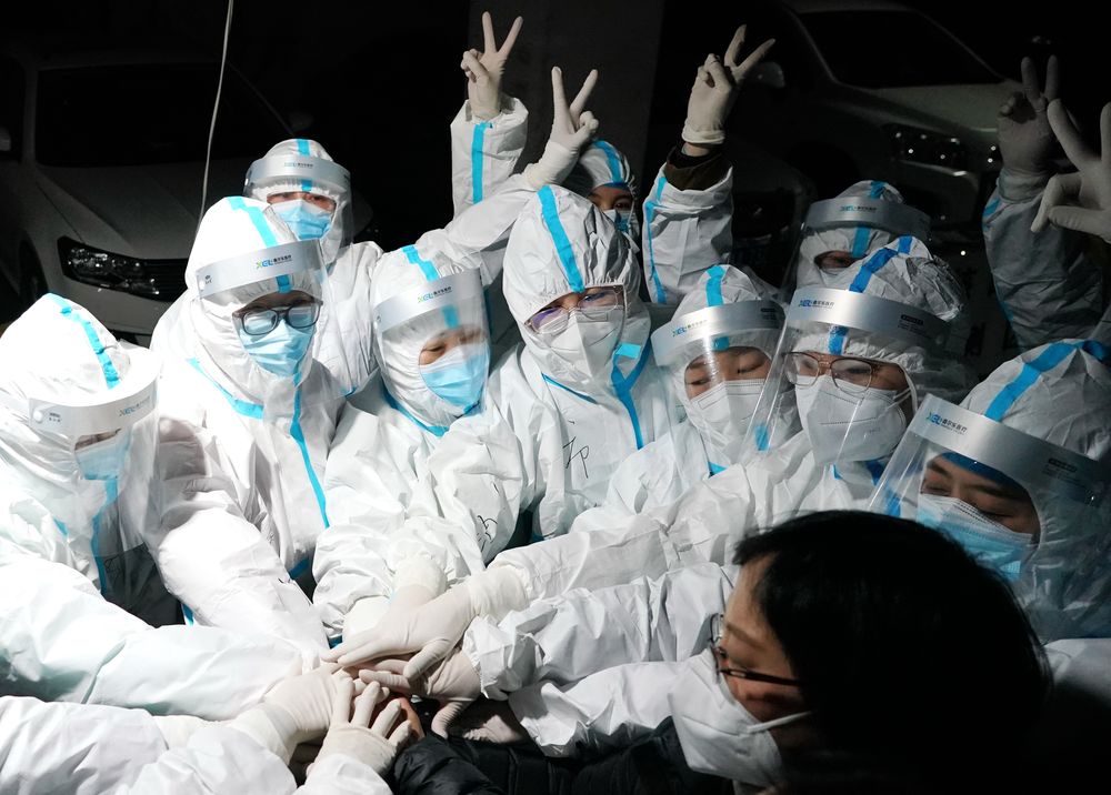 ↑1月7日,在石家莊市裕華區(qū)九里庭院社區(qū),醫(yī)務(wù)人員開(kāi)展核酸檢測(cè)前相互加油鼓氣。