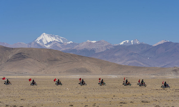 和高原的許多牧民一樣,石覺塔布是個“騎士”。從前,他騎馬放牧;現(xiàn)在,他騎摩托車守邊。作為昌果邊境派出所摩托車巡邏隊(duì)的隊(duì)長,這天,他要帶隊(duì)進(jìn)行邊境巡防訓(xùn)練。