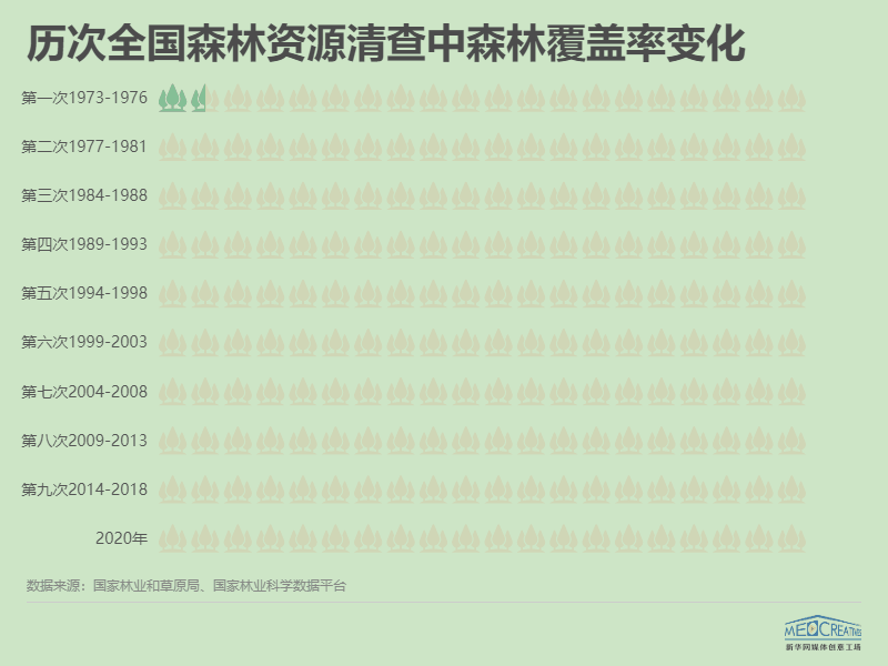 從1973年到2020年,47年時(shí)間里,我國(guó)的森林覆蓋率從12.7%增長(zhǎng)到23.04%,幾乎增長(zhǎng)了一倍。