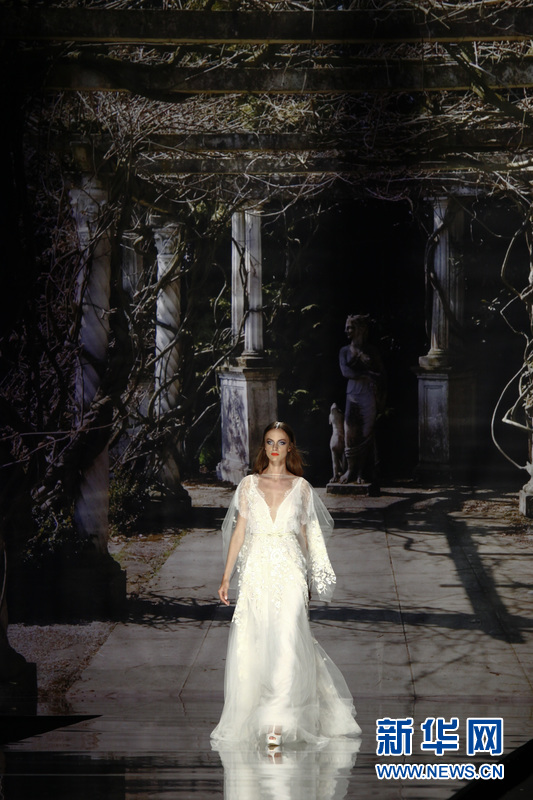 模特在T臺(tái)上展示西班牙品牌Yolan Cris的婚紗。Yolan Cris品牌由Yolanda和Cristina姐妹聯(lián)手打造,同時(shí)這也是來自巴塞羅那當(dāng)?shù)氐囊粋€(gè)婚紗品牌。