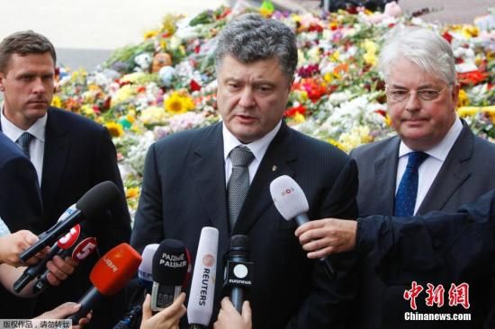 當?shù)貢r間7月21日,烏克蘭基輔,烏克蘭總統(tǒng)波羅申科在荷蘭駐烏克蘭大使館外悼念馬航MH17遇難者。