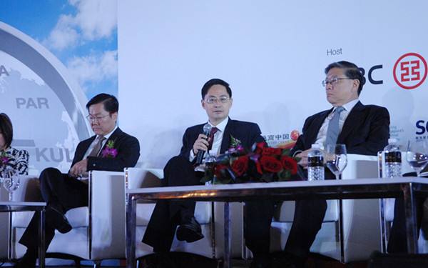 圖為2014年9月22日,中國人民銀行首席經(jīng)濟(jì)學(xué)家馬駿(中)在工行新加坡分行舉辦的人民幣國際化峰會上分享看法。當(dāng)日,中新兩國金融及其他企業(yè)界人士、政府官員等數(shù)百人參加了舉行的人民幣國際化峰會,共同討論人民幣國際化的前景和路徑。