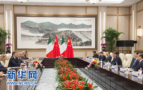 習近平歡迎倫齊來華出席二十國集團領導人杭州峰會。習近平指出,近年來,中意關系取得長足進步,雙方秉承相互尊重、互利共贏精神,深化政治互信,擴大務實合作,使兩國人民獲得實實在在的利益。中方愿同意方攜手努力,不斷推進兩國全面戰(zhàn)略伙伴關系向前發(fā)展。我們要堅持兩國戰(zhàn)略互信大方向,尊重彼此核心利益和重大關切,密切兩國政府、議會、政黨交流合作。要堅持互利共贏原則,優(yōu)勢互補,實現(xiàn)共同發(fā)展。中方歡迎意方積極參與“一帶一路”建設。我們要以古老文明為依托,密切人文交流,深化傳統(tǒng)友誼。要加強在國際和地區(qū)事務中的協(xié)調(diào)和配合,努力構建以合作共贏為核心的新型國際關系。要將中歐和平、增長、改革、文明四大伙伴關系落到實處,共同維護中歐關系良好發(fā)展勢頭。