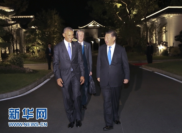 9月3日晚,國家主席習(xí)近平在杭州西湖國賓館與前來出席二十國集團(tuán)領(lǐng)導(dǎo)人杭州峰會的美國總統(tǒng)奧巴馬交談。 新華社記者 蘭紅光 攝
