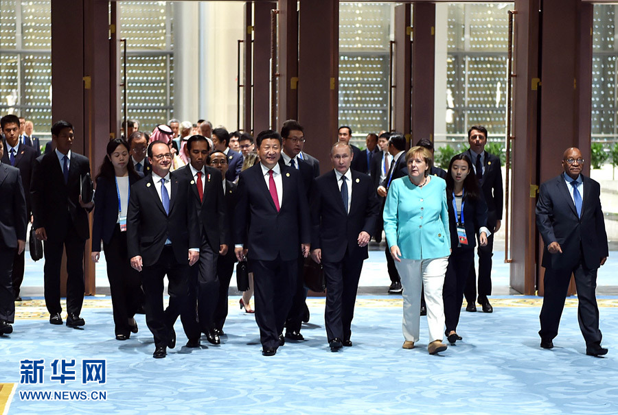 ??? 9月4日,二十國集團(tuán)領(lǐng)導(dǎo)人第十一次峰會在杭州國際博覽中心舉行。國家主席習(xí)近平主持會議并致開幕辭。這是二十國集團(tuán)成員和嘉賓國領(lǐng)導(dǎo)人、有關(guān)國際組織負(fù)責(zé)人步入會場。新華社記者李濤攝