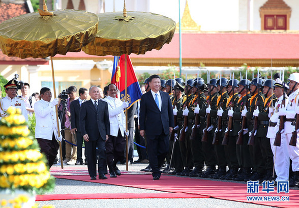 13日晚,西哈莫尼國(guó)王在王宮吉祥殿舉行盛大晚宴,歡迎習(xí)近平主席來(lái)訪(fǎng)。西哈莫尼國(guó)王和習(xí)近平主席先后發(fā)表熱情洋溢的講話(huà)。柬埔寨演員們演唱了一首又一首中文歌曲,演唱了西哈努克創(chuàng)作的歌頌柬中友誼的歌曲。柬埔寨王室成員悉數(shù)出席。晚宴結(jié)束時(shí),全體王室成員到王宮外同習(xí)近平主席道別。習(xí)近平主席同洪森首相原定15分鐘的大范圍會(huì)談,時(shí)間一再延長(zhǎng),持續(xù)了將近一個(gè)半小時(shí)。隨后又進(jìn)行了深入的小范圍會(huì)談。兩國(guó)領(lǐng)導(dǎo)人傾心相談,意猶未盡。14日清晨,習(xí)近平主席結(jié)束訪(fǎng)問(wèn)離開(kāi)金邊前,洪森又邀請(qǐng)他共進(jìn)早餐,利用這短暫的寶貴時(shí)間繼續(xù)昨天的話(huà)題。