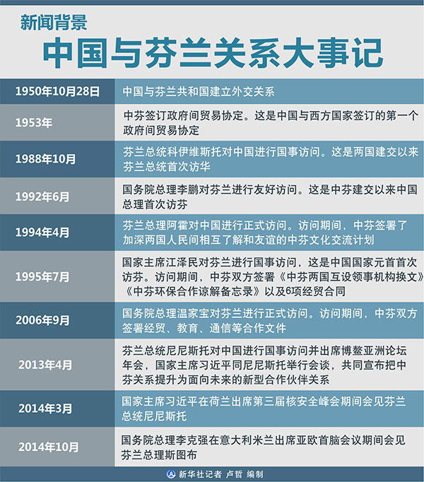 ?。玻埃保衬辏丛拢姨m總統(tǒng)尼尼斯托對中國進(jìn)行國事訪問并出席博鰲亞洲論壇年會,國家主席習(xí)近平同尼尼斯托舉行會談,共同宣布把中芬關(guān)系提升為面向未來的新型合作伙伴關(guān)系。