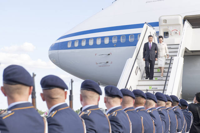 專(zhuān)機(jī)進(jìn)入德國(guó)領(lǐng)空,兩架德國(guó)空軍戰(zhàn)機(jī)升空護(hù)航。專(zhuān)機(jī)抵達(dá)柏林,習(xí)近平主席和夫人彭麗媛步出艙門(mén),現(xiàn)場(chǎng)鳴21響禮炮,戰(zhàn)機(jī)在空中飛越致意。