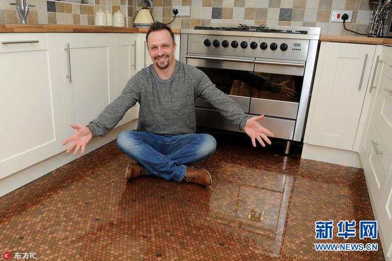 【酷!銅幣廚房】2017年2月4日,來自英國特爾福德的Matt Giles用一便士硬幣當(dāng)瓷磚,共用2.7萬枚銅幣打造出了自己夢(mèng)寐以求的廚房地面。