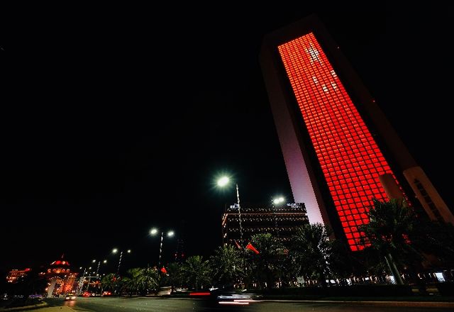 2018年7月18日夜晚拍攝的阿布扎比國(guó)家石油公司大樓。新華社記者 鄭開君攝