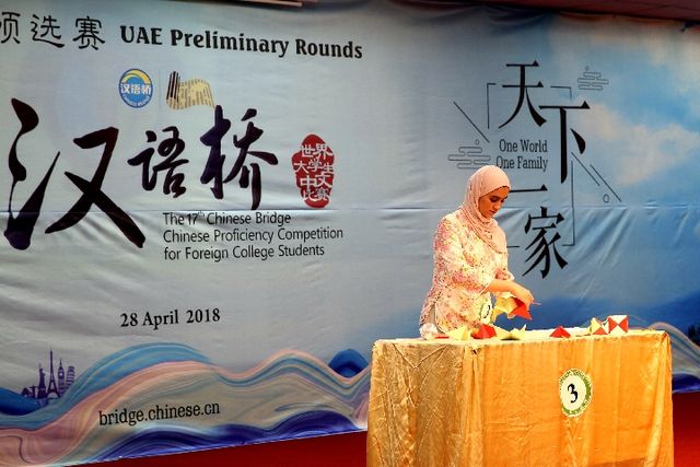 2018年4月28日, 第17屆“漢語(yǔ)橋”世界大學(xué)生中文比賽阿聯(lián)酋賽區(qū)預(yù)選賽上,扎耶德大學(xué)18歲的大一女生獲得冠軍。新華社記者 蘇小坡攝