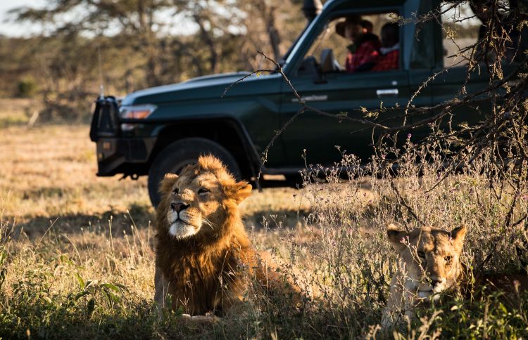 2018年7月7日,在肯尼亞馬賽馬拉大草原奧肯耶保護區(qū),星巴和當(dāng)?shù)匮策墕T觀察獅群情況。新華社記者呂帥攝