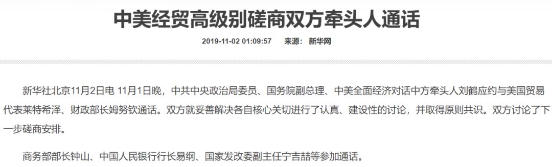 在充滿“變”的世界中,中美經(jīng)貿(mào)磋商進(jìn)程也在發(fā)生著變化。11月1日晚,中美經(jīng)貿(mào)高級別磋商雙方牽頭人通了電話。