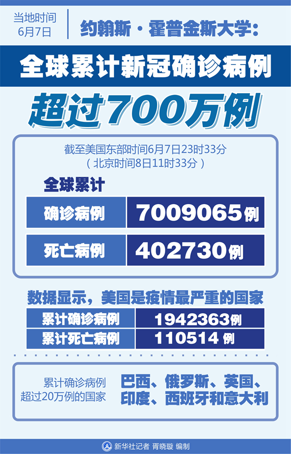 新華社紐約6月7日電 美國約翰斯·霍普金斯大學(xué)7日發(fā)布的新冠疫情統(tǒng)計(jì)數(shù)據(jù)顯示,截至美國東部時(shí)間7日23時(shí)33分(北京時(shí)間8日11時(shí)33分),全球累計(jì)確診病例達(dá)到7009065例,死亡病例為402730例。
