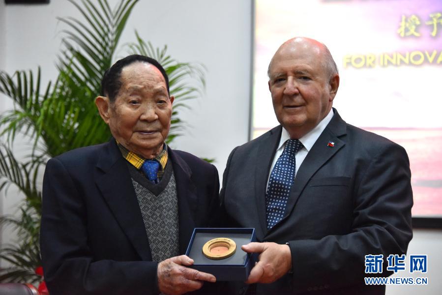 11月16日,智利駐華大使路易斯·施密特·蒙特斯向袁隆平頒發(fā)“中智建交50周年紀(jì)念獎(jiǎng)?wù)隆薄P氯A社記者 周勉 攝