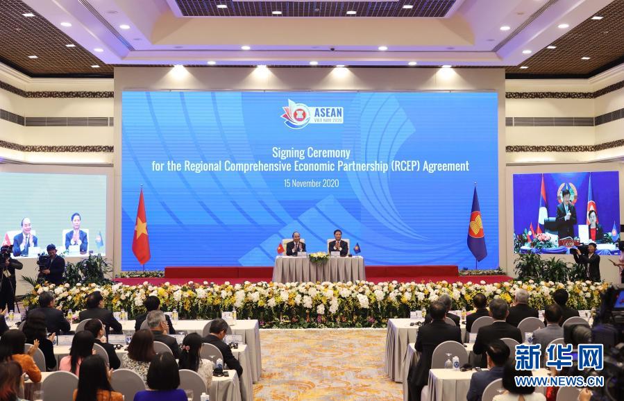 這是11月15日在越南首都河內(nèi)拍攝的區(qū)域全面經(jīng)濟(jì)伙伴關(guān)系協(xié)定(RCEP)簽署儀式現(xiàn)場(chǎng)。新華社/越通社