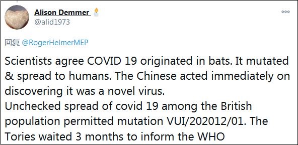 還有一名網(wǎng)友對(duì)比稱:“科學(xué)家同意新冠病毒起源自蝙蝠,變異后傳播給人類,中國(guó)人發(fā)現(xiàn)這是一種新病毒后,立即采取了行動(dòng)。新冠病毒在英國(guó)人口中無(wú)限制的傳播,導(dǎo)致了變異新冠病毒(VUI/202012/01),保守黨等了3個(gè)月才通知世衛(wèi)組織?!?/p>