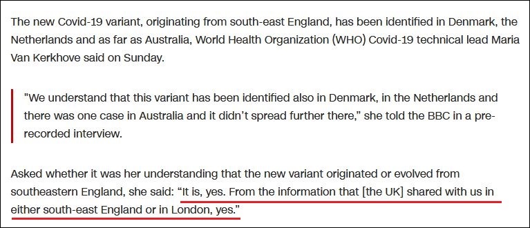 12月20日,世衛(wèi)組織緊急項(xiàng)目技術(shù)主管瑪麗亞·范·克爾科夫(Maria Van Kerkhove)曾在采訪中被問(wèn)及變異病毒是否起源或在英國(guó)東南部進(jìn)化的問(wèn)題,她回答說(shuō):“是的。從英國(guó)和我們分享的信息來(lái)看,要么是在英國(guó)東南部,要么是在倫敦。是的?!?/p>