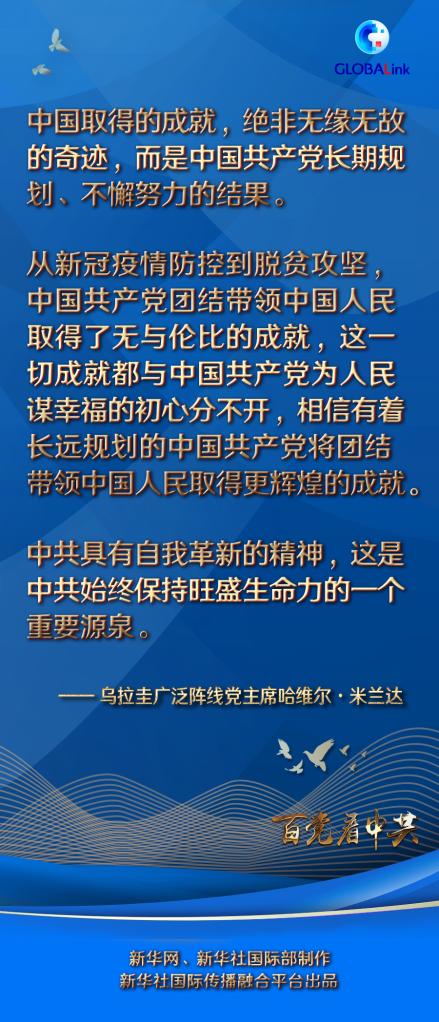今年是中國(guó)共產(chǎn)黨建黨百年,米蘭達(dá)代表烏拉圭廣泛陣線(xiàn)黨表示熱烈祝賀。他表示,中共具有自我革新的精神,這是中共始終保持旺盛生命力的一個(gè)重要源泉。